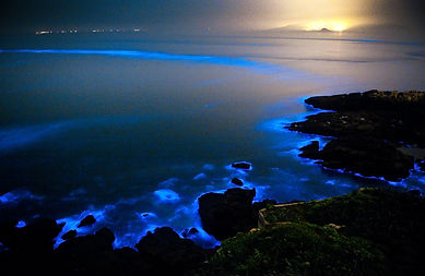 每年4~5月的孟夏夜晚,海岸邊不定時會出現淡藍色螢光,是螢光藻類形成的自然現象,被稱為「藍眼淚」。